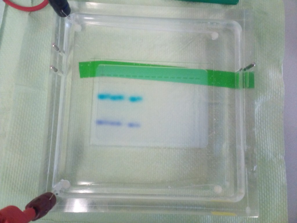 Das Gel läuft: (Die farbigen Punkte sind Farben, die man in die Proben hinzugefügt hat, um ohne UV-Licht abschätzen zu können, wie weit die Proben schon gelaufen sind)