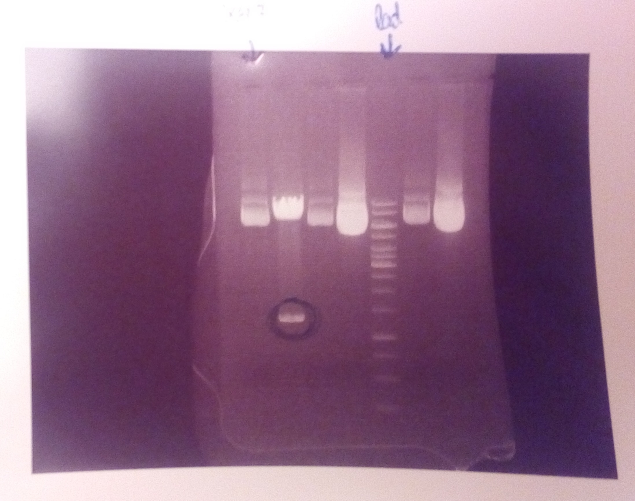 Eine schwarz-weiß Fotografie eines Agarosegels unter UV-Licht.
