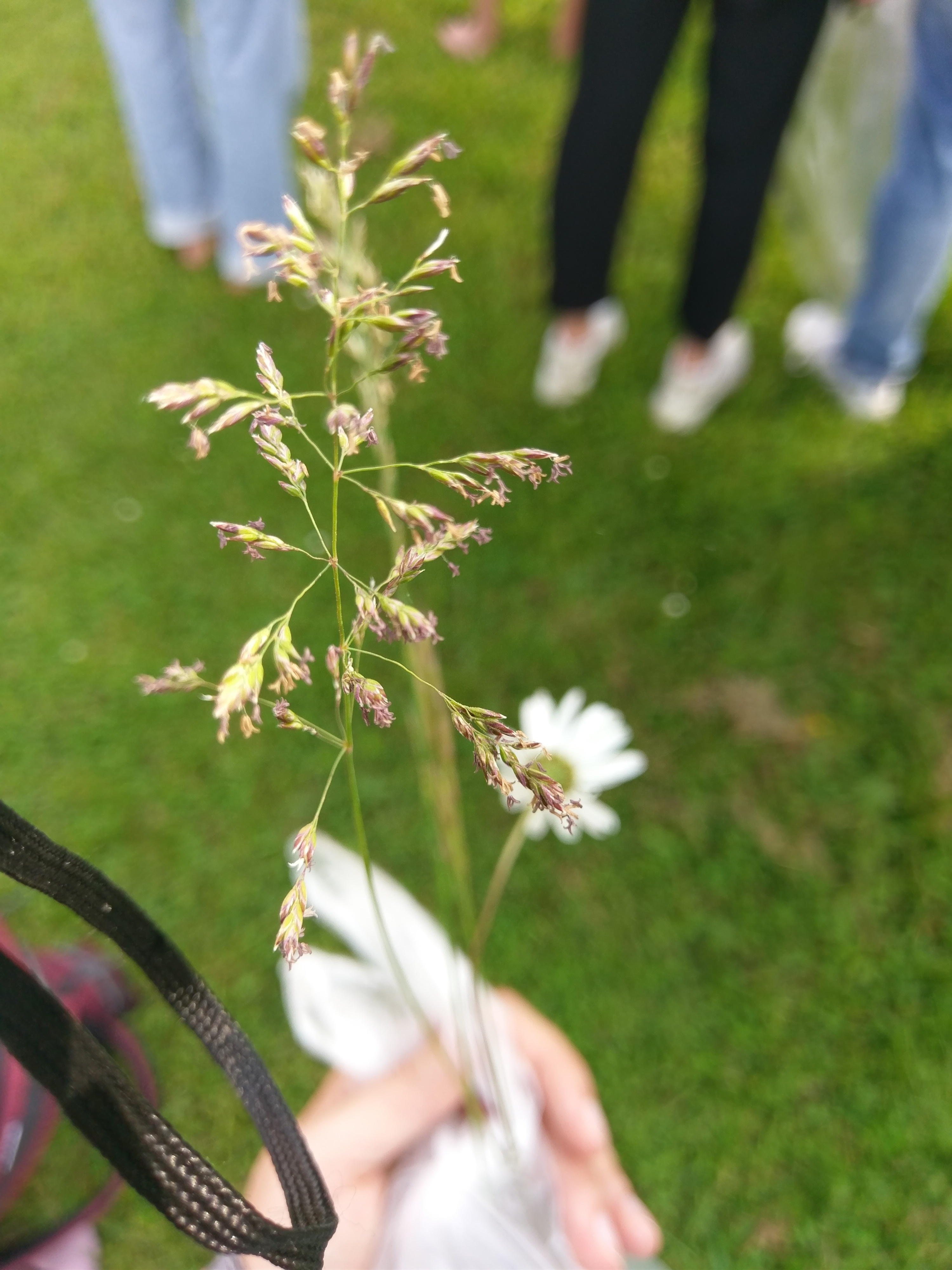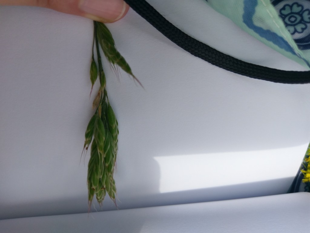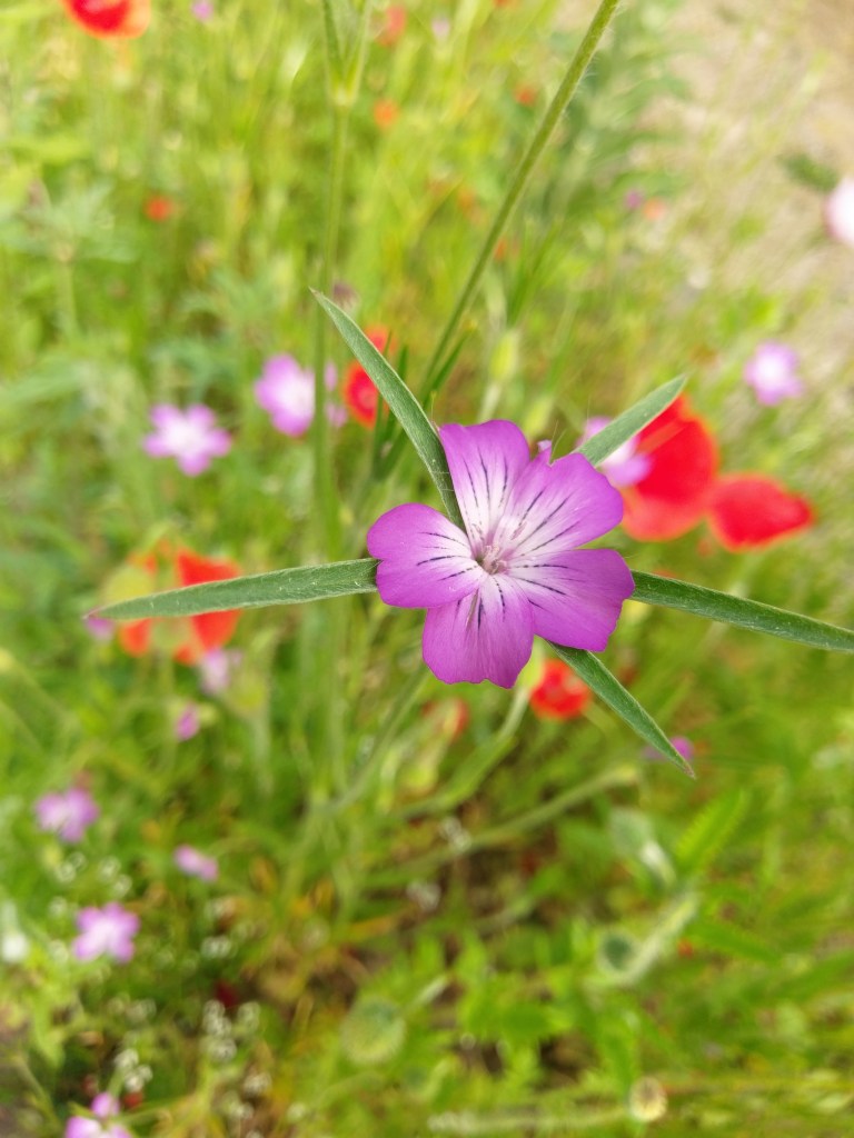 Wiesen-Rispengras (blüht) – 2 Arten möglich: Poa pratensis oder Poa trivialis. Wenn man ein Laubblatt am Stängel herunterzieht, sieht man ein Häutchen – längeres Häutchen (Häutchen = Ligula) ist Poa trivialis. Kürzeres Häutchen = Poa pratensis.Lolium perenne, deutsches Weidelgras (blüht gerade). Ährengras (ungestielte Ährchen) in flacher FormWeiche Trespe, Bromus hordeaceus (Familie Poaceae). Ist tatsächlich sehr weich – an den Ährchen und am StängelKorn-Rade, Agrostemma githago L., Familie der Nelkengewächse (Form eines ausgerissenen Kronblatts lässt darauf schließen mit Platte und Nagel; 5 zählige Blüte (5 Kelchblätter also das grüne, 5 Kronblätter also das lilafarbene, 5 Griffel also Teil des weiblichen Blütenorgans). Kelchblätter zudem röhrig verwachsen, was man bei dieser Perspektive nicht sieht und mit erhabenen Rippen auf dem Kelch was man auch nicht sieht). Dichasium nicht zu erkennen.