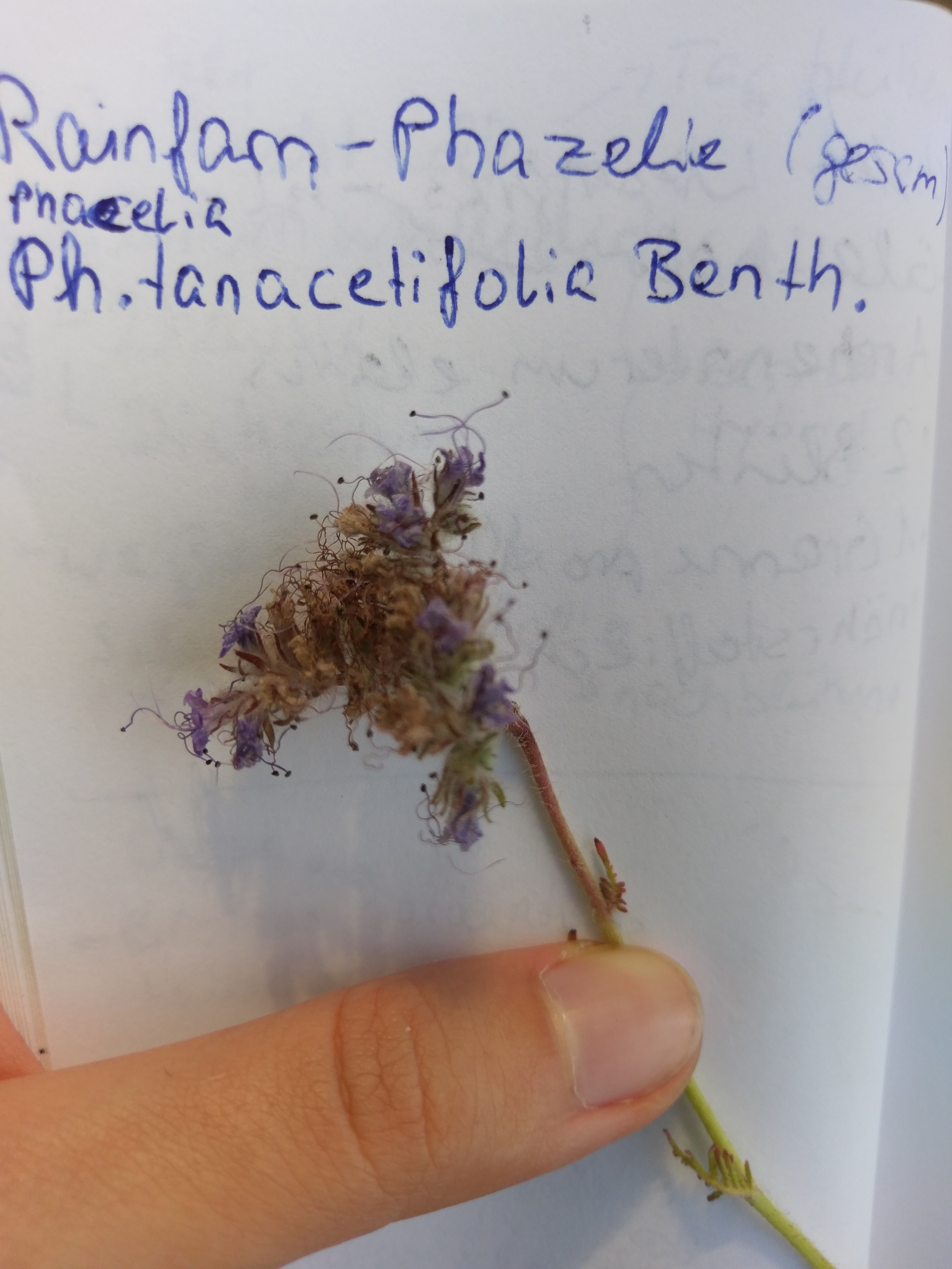 Rainfarn-Phacelie, gehört zur Familie der Rauhblattgewächse (Blütenstand steht im „Wickel“, hier schlecht zu erkennen, weil schon die letzten Blüten des Blütenstandes blühen. Ein Wickel ist eingerollt und blüht von unten nach oben. Also zuerst blühen die Blüten ganz unten und die oberen sind noch in Knospen und der Stängel an dem die Knospen sitzen, ist eingerollt. Ein paar Tage später blühen die Blüten weiter oben und die unteren verwelken. So wird über längere Zeit von unten nach oben geblüht und aufgerollt und die Insekten kriegen immer eine frische Blüte.) Blüten hier violett, Fortpflanzungsorgane ragen weit über Kronblätter hinaus. Blätter gefiedert. Oben viele Haare an Sprossachse (=Pflanzenstängel) wie typisch bei den Rauhblattgewächsen.
