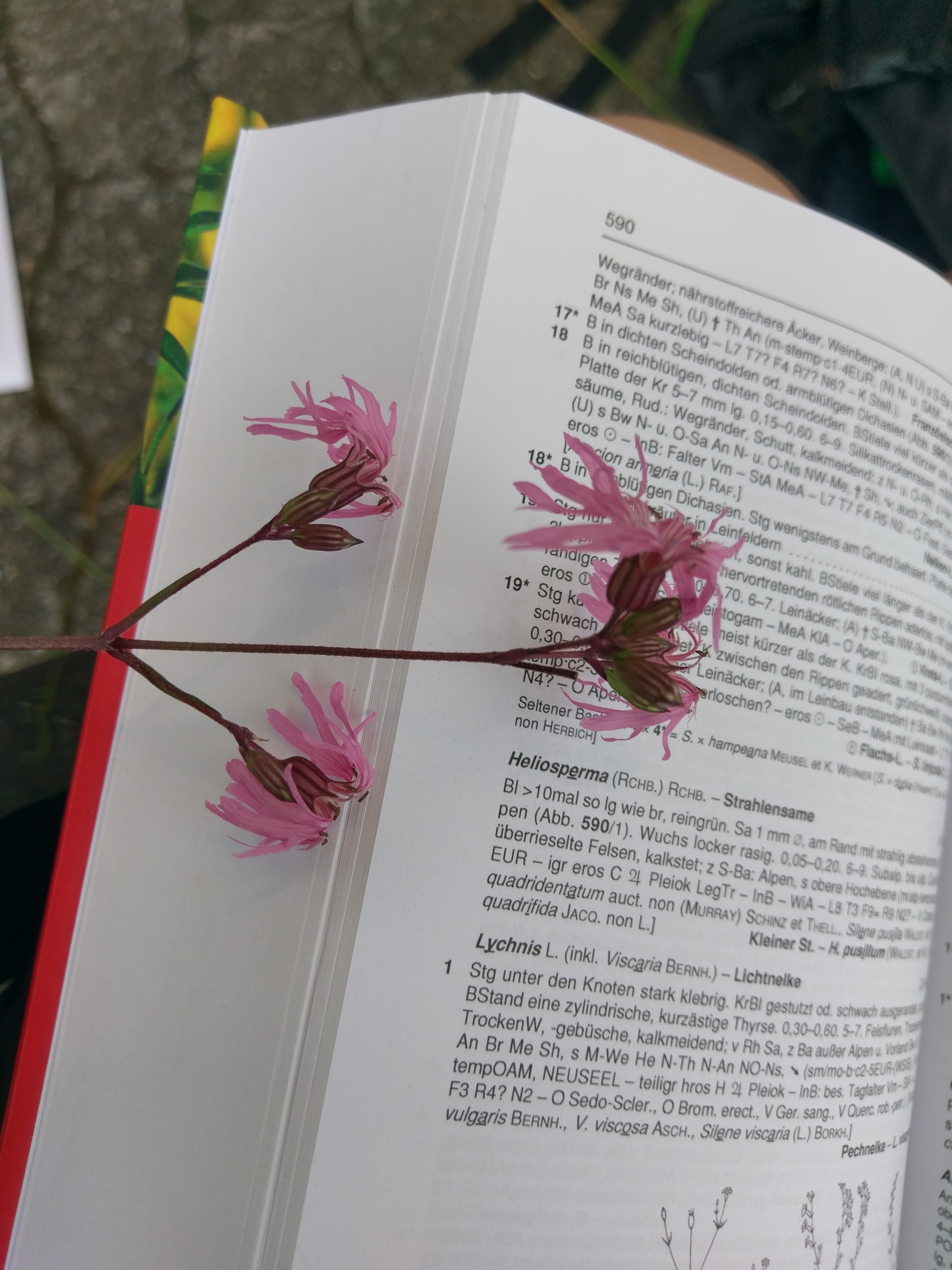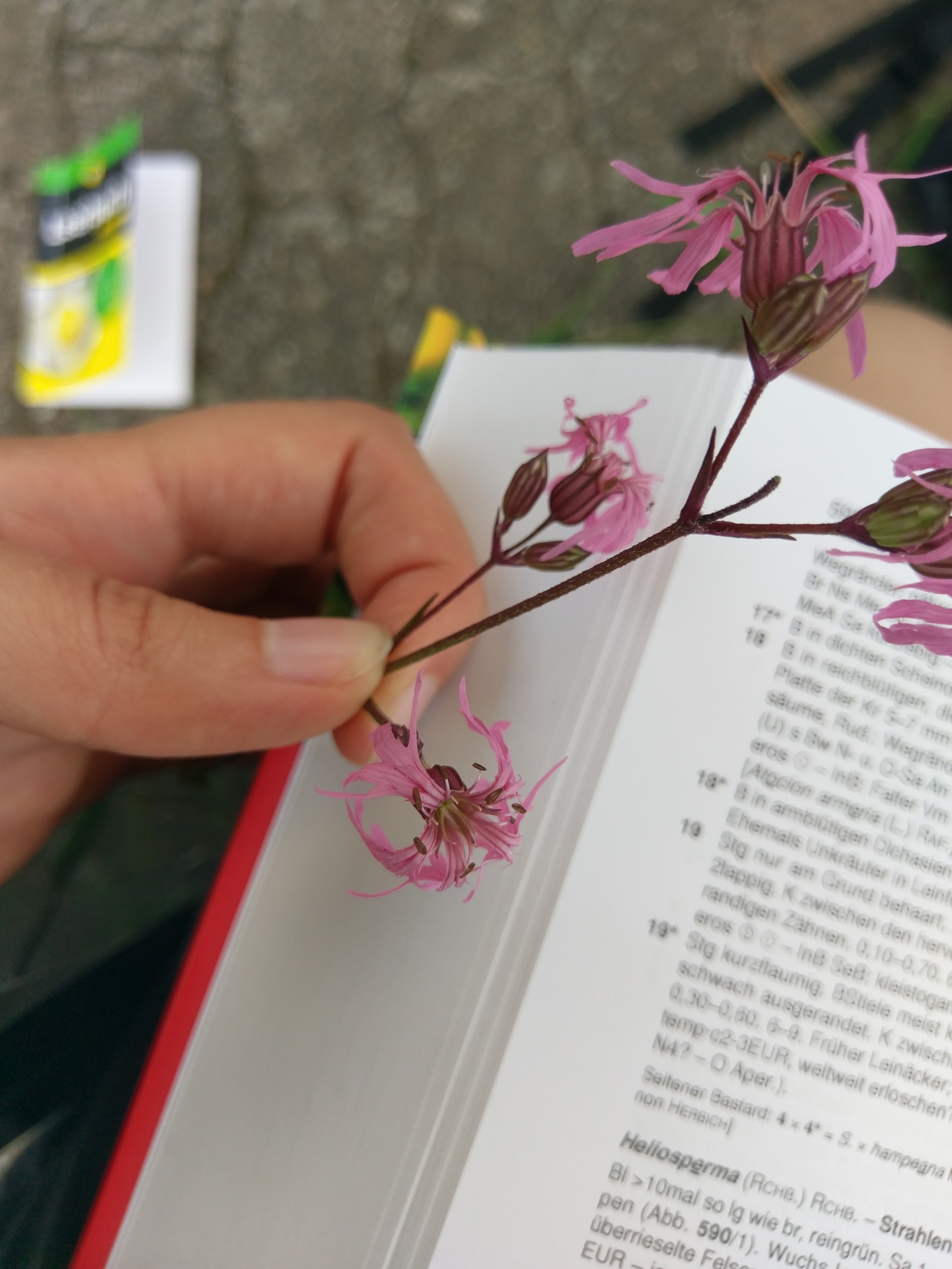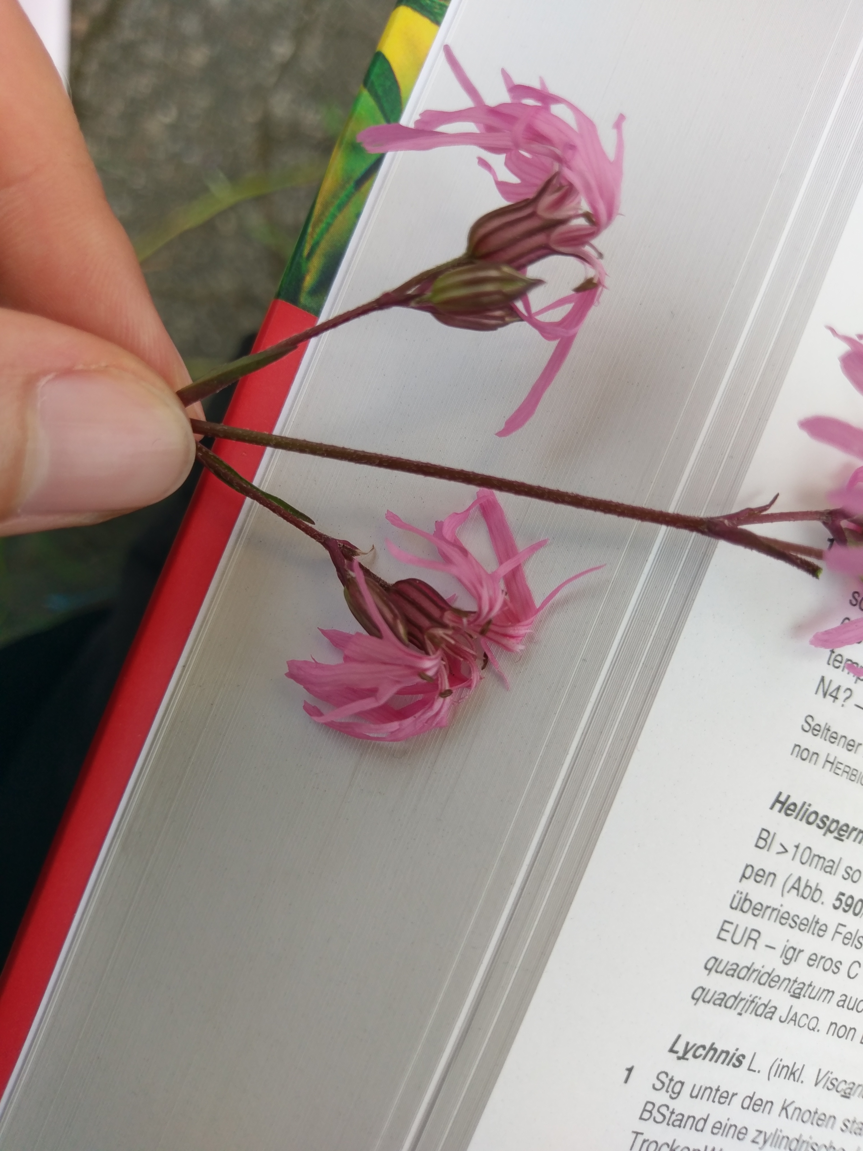 Von den Lichtnelken (Lychnis) eine Kuckucks-Lichtnelke. Jedes Kronblatt (von insgesamt 5 Kronblättern) ist tief geteilt. 5 Griffel (Teil eines weiblichen Blütenorgans, geht vom Fruchtknoten in der Mitte ab). Nelkengewächse haben oft längliche, gegenständige Blätter (gegenständig: Blätter sind auf der gleichen Höhe und genau gegenüber), sowie röhrig verwachsene Kelchblätter (Kelchblätter sind die „Hülle“ der Knospe – bevor die Blüte aufgeht)