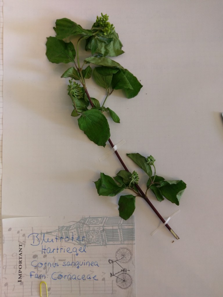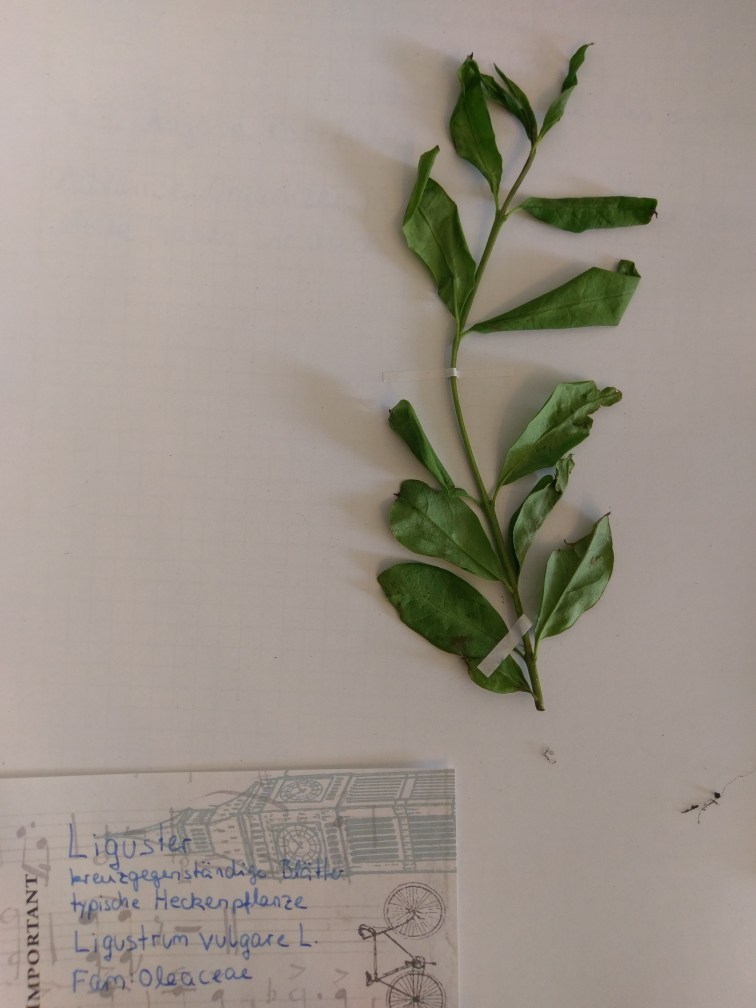 Liguster also Ligustrum vulgare L. aus der Familie der Oleaceae (Ölbaumgewächse). Das ist eine typische Heckenpflanze aus den 70er Jahren (Harry Potter wohnte bei den Dursleys im Ligusterweg…) und man kann es daran erkennen wie die Blätter zueinander stehen – kreuzgegenständig. Das bedeutet 2 Blätter stehen sich immer genau gegenüber und die nächst höheren sind zu den unteren um 90° gedreht. Die Blätter sind lanzettförmig und ganzrandig (also spitz zulaufend, relativ schmal und der Blattrand hat keine Zähne o.ä.)