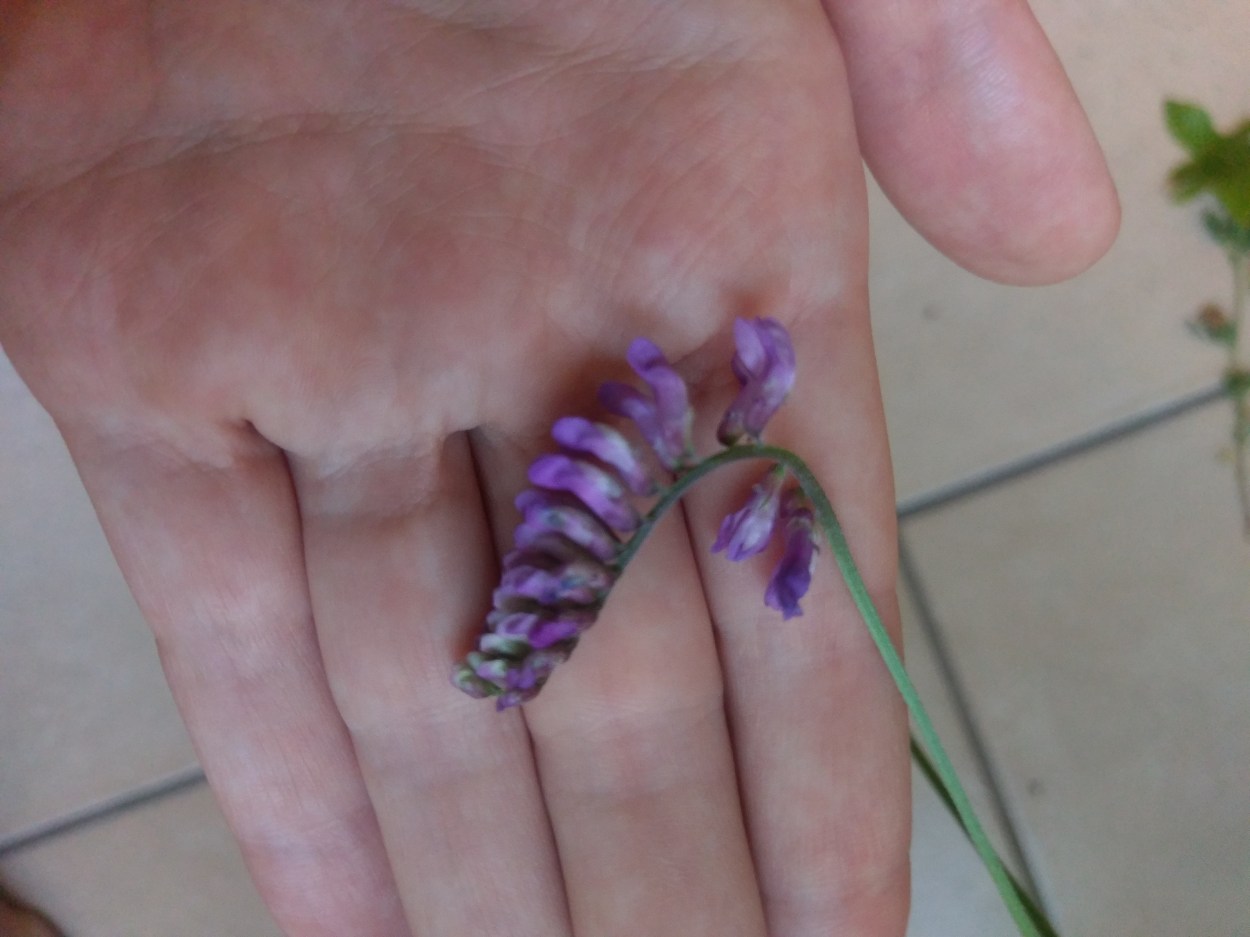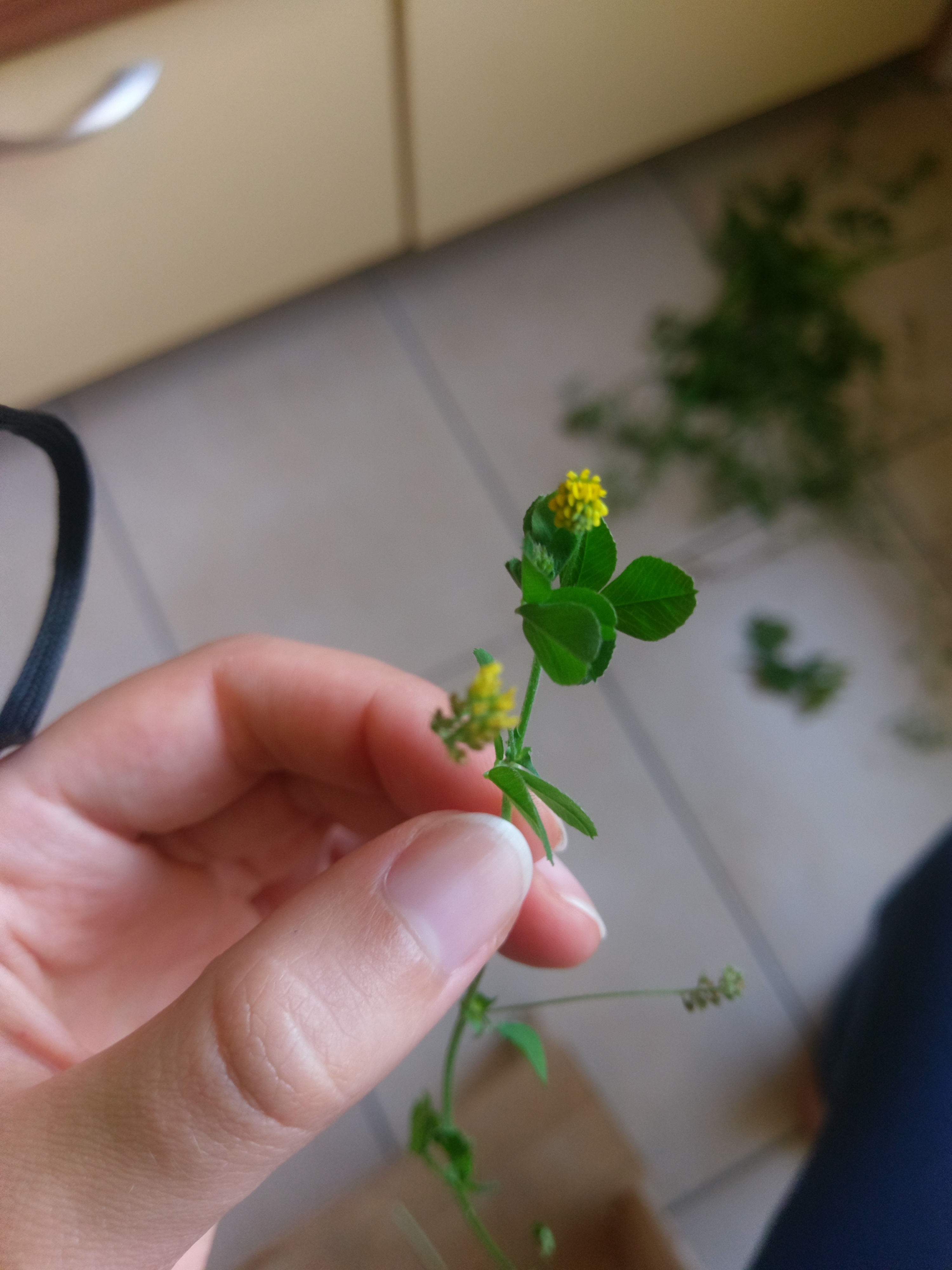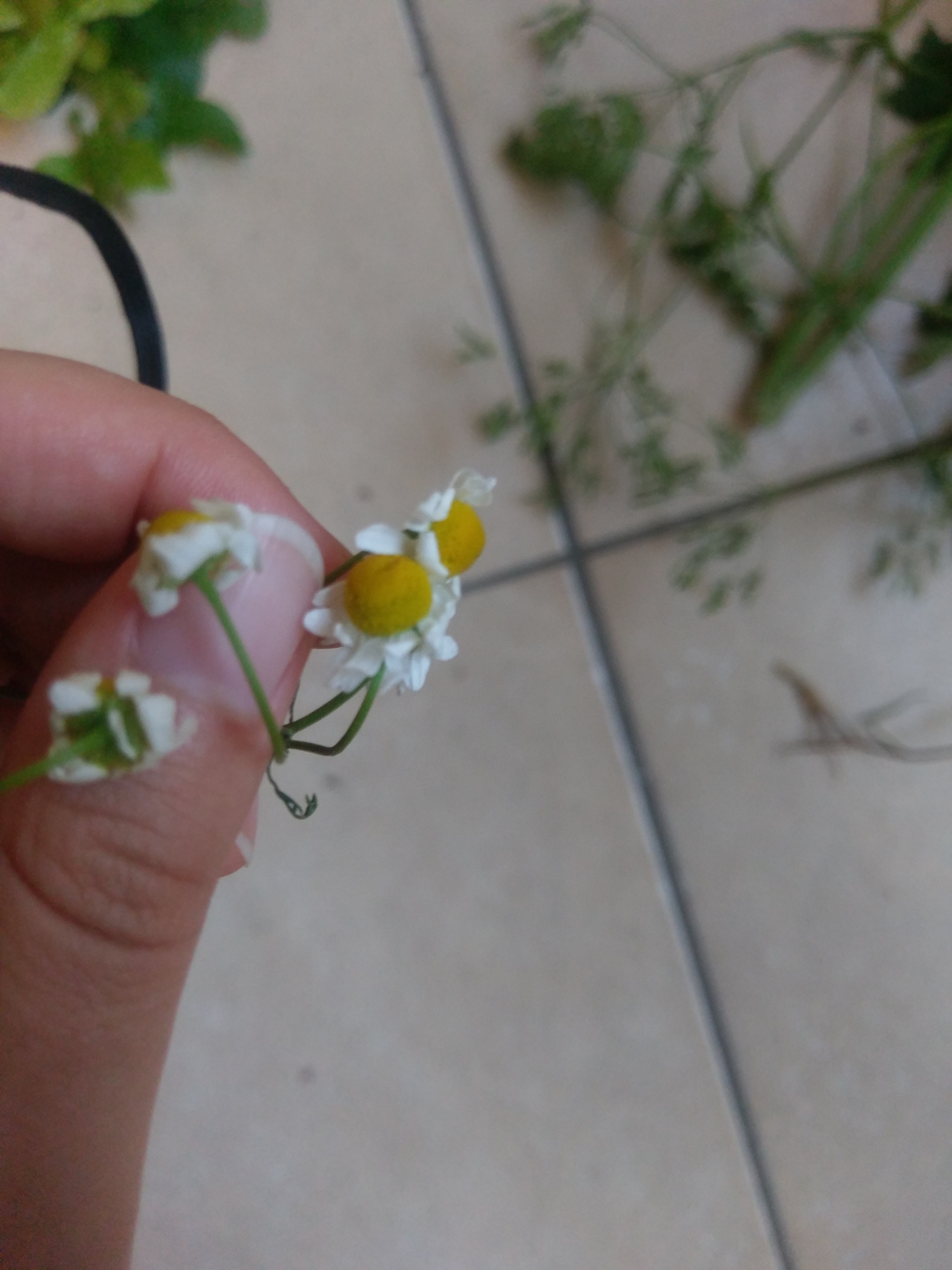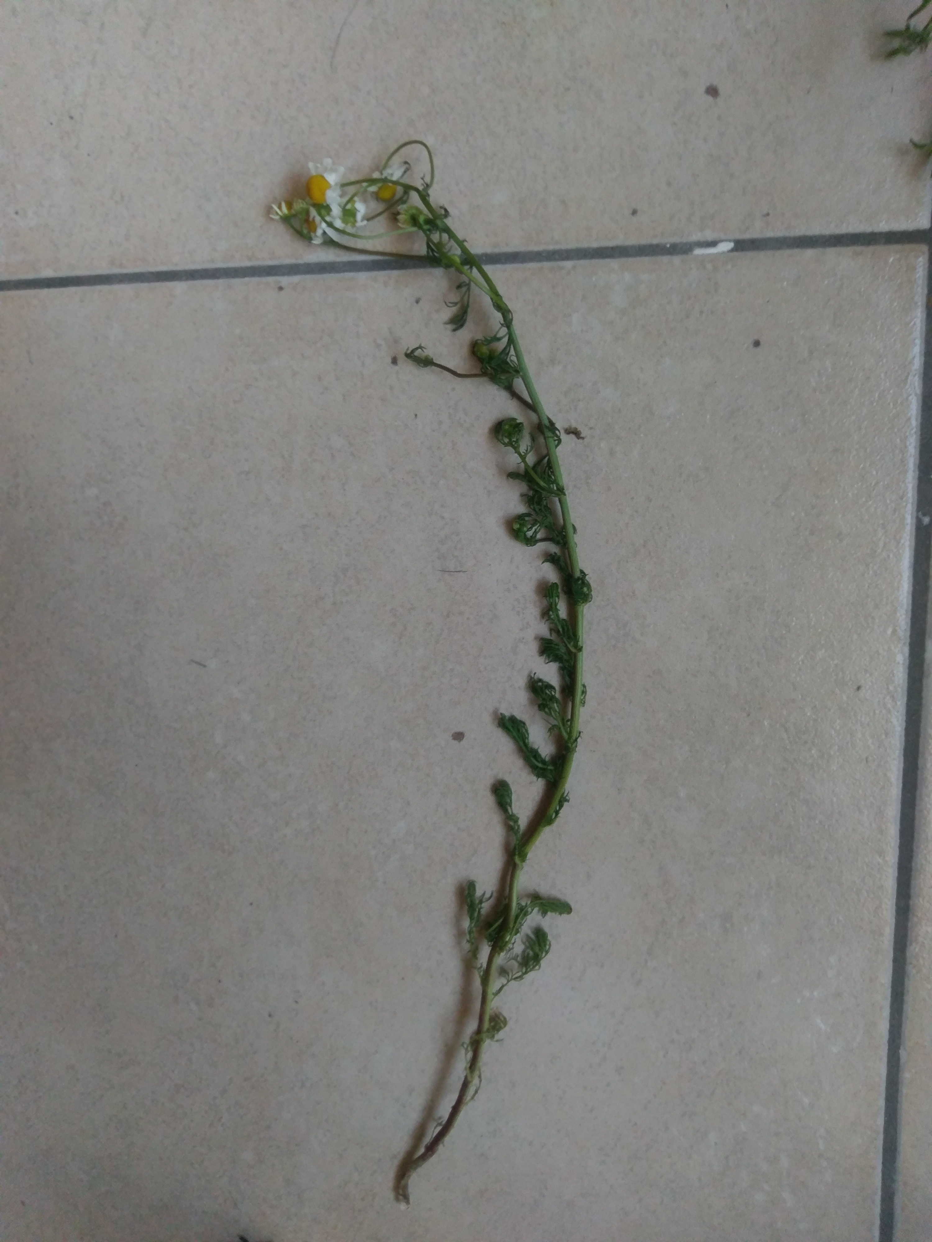 Kamille (leider gerade recht angewelkt, die Zungenblüten (=die weißen „Blütenblätter“) sind eigentlich ausgestreckt). Wie die echte Kamille unter ihren vielen Doppelgängern unterscheiden? Sie riecht stark nach Kamille wenn man eine Blüte zerreibt. Verblühende Blütenköpfe klappen die Zungenblüten um, so dass ein Federball-artiges Gebilde entsteht. Der Blütenkopf ist innen hohl (kegelartig aufgewählter Köpfchenboden).