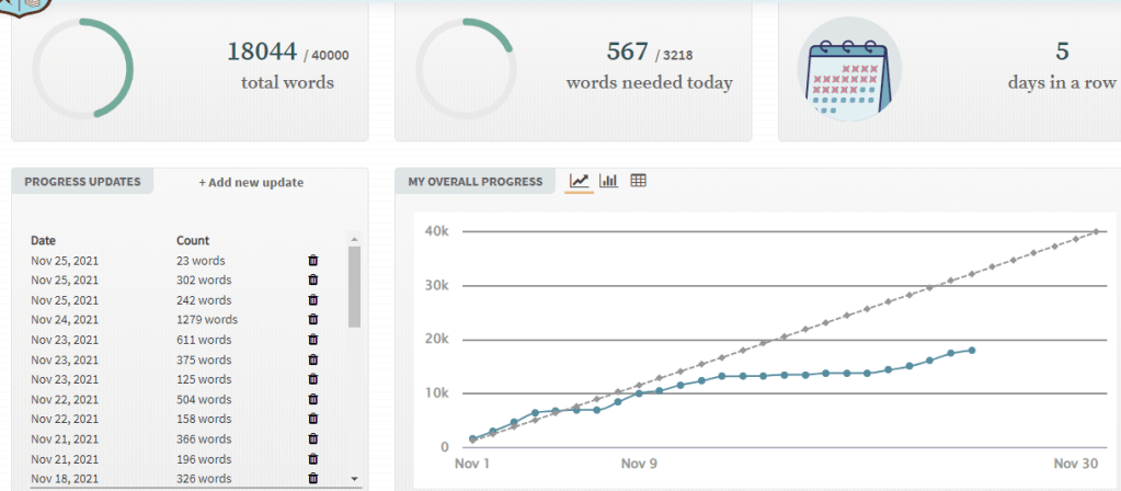 Heute tippte ich die Worte „Ende“, habe aber erst 18.000 Worte erreicht. Eigentlich war der Plan einen abgeschlossenen Kurzroman von 40.000 Worten zu schreiben. Der Mittelteil und das Ende entsprechen inhaltlich dem Plan, den ich vorher gemacht habe (Plot), obwohl viele Fragen offen bleiben – für eine Figur…