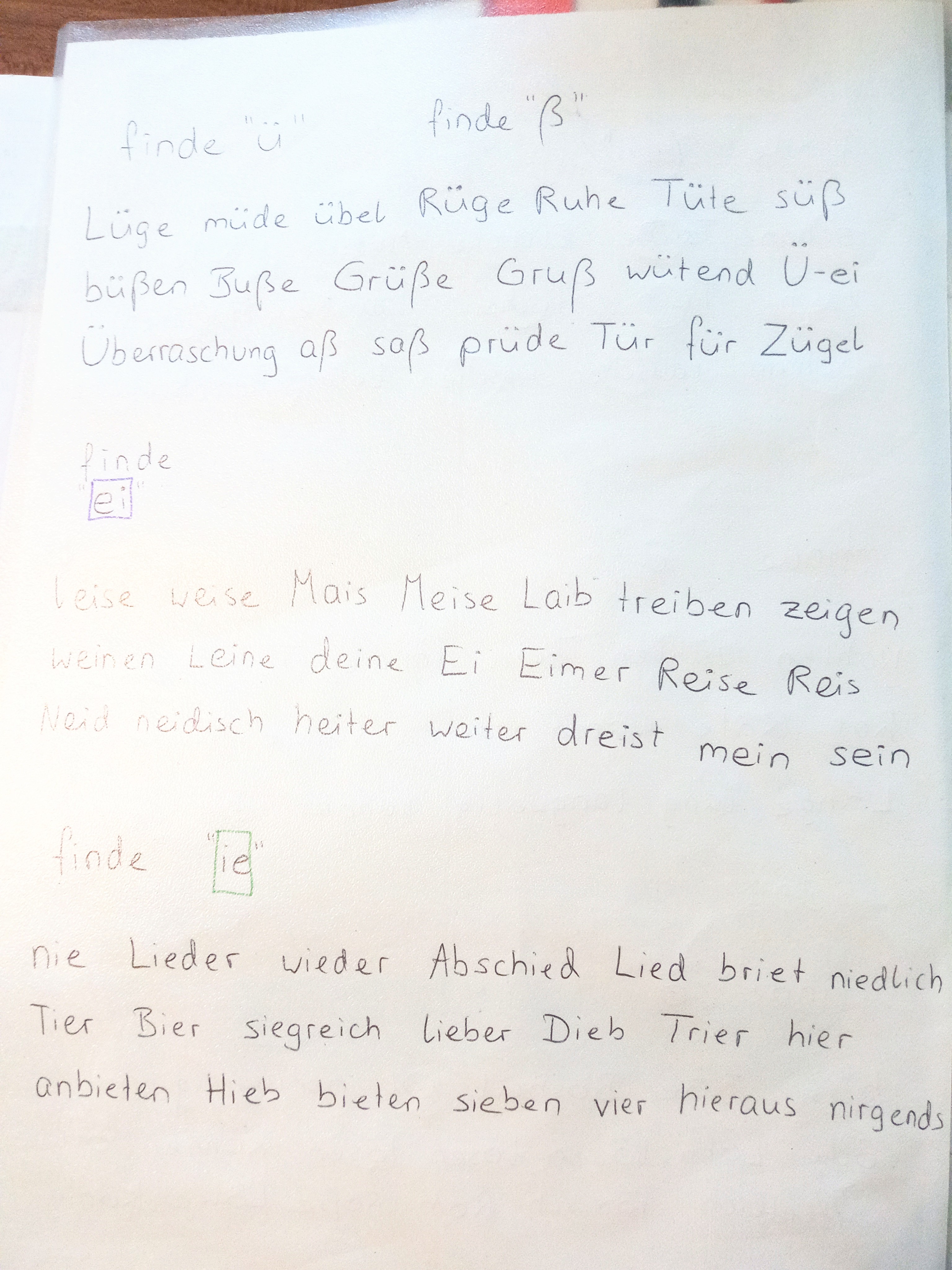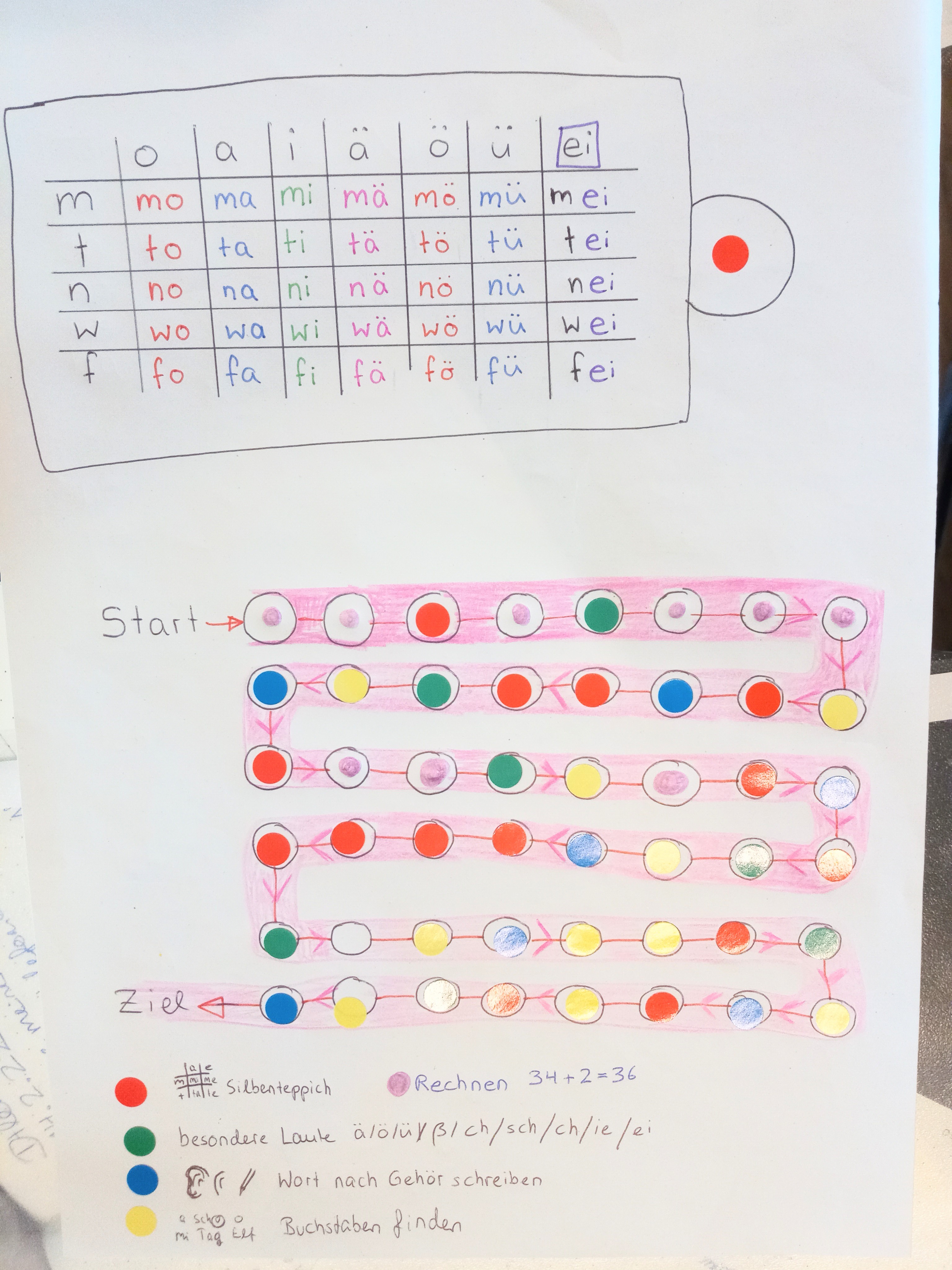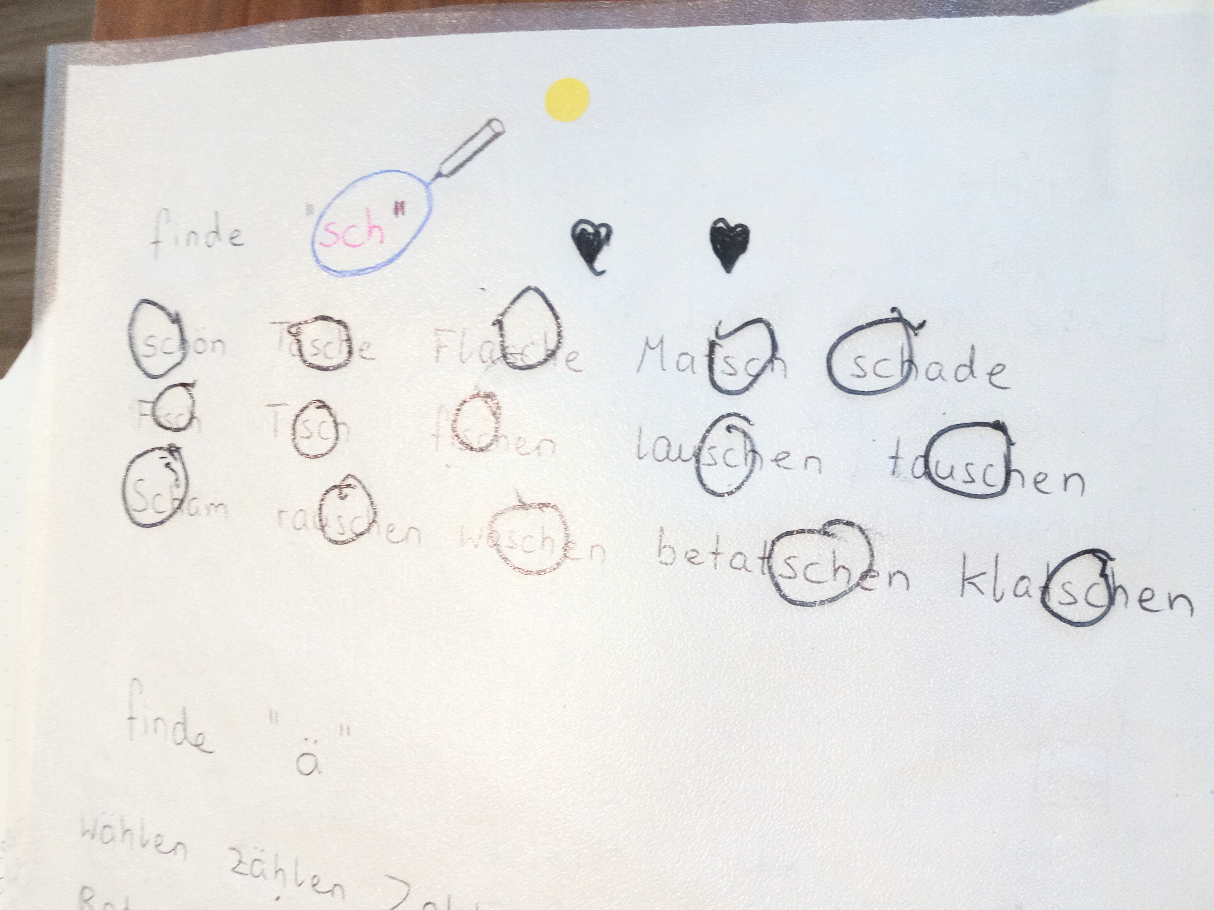 Auch das Erkennen von Buchstabenkombinationen (finden und einkreisen) hilft dem Kind dabei Buchstaben /-kombinationen zu erkennen mit denen es sich schwer tut. Außerdem sorgt die vergleichsweise leichte Aufgabe für Auflockerung. Generell sollte das Spiel nicht so schwer sein, dass das Kind frustriert wird. Wenn du merkst, dass es sich zu sehr anstrengen muss / bockig wird / sich nicht konzentriert – dann hör auf und mach leichtere Aufgaben. Dem Kind vorzulesen hilft auch und kann eine Abwechslung sein, die Stress raus nimmt, falls gerade eine Aufgabe schwer war und das Kind Auflockerung braucht.