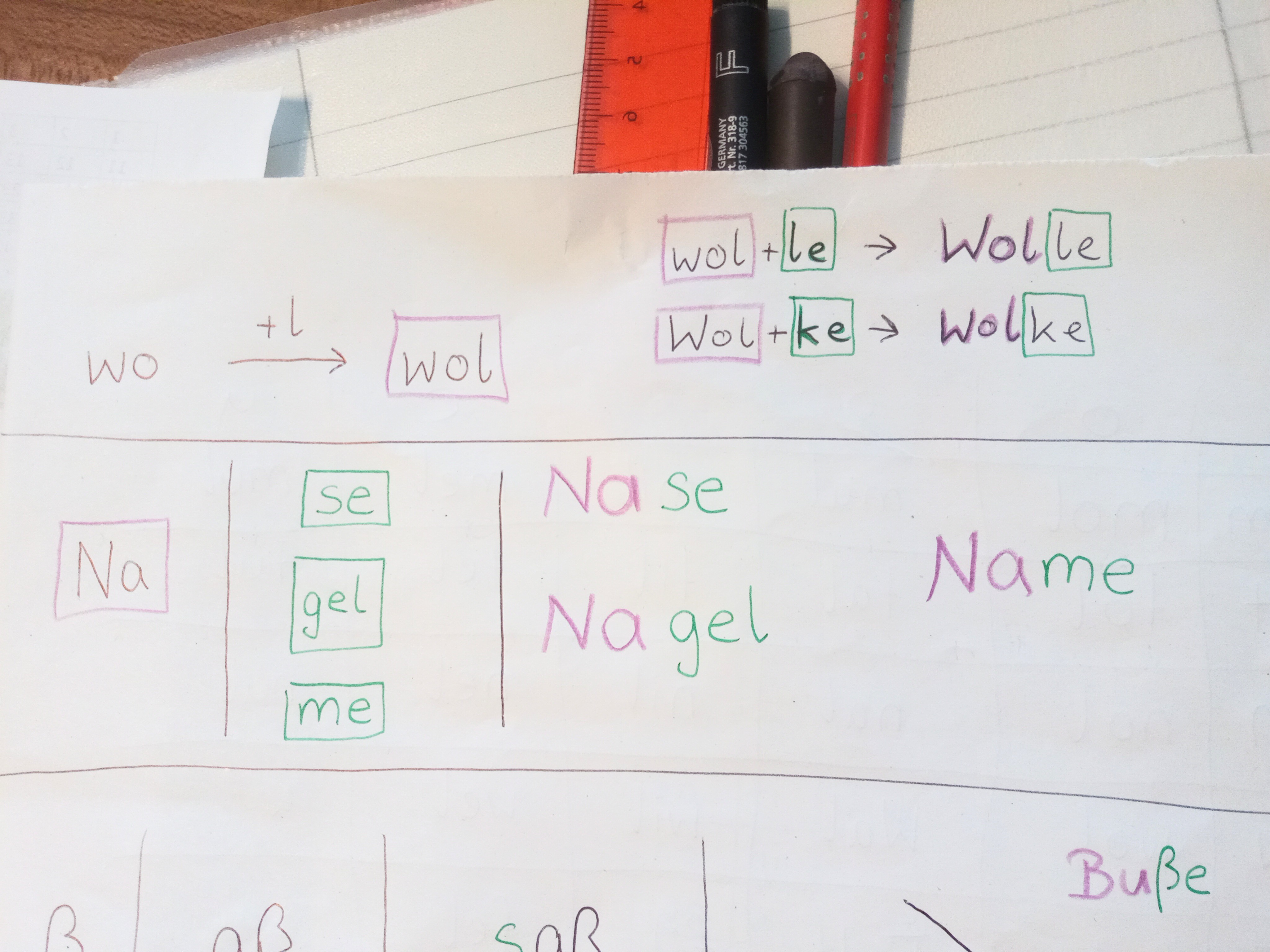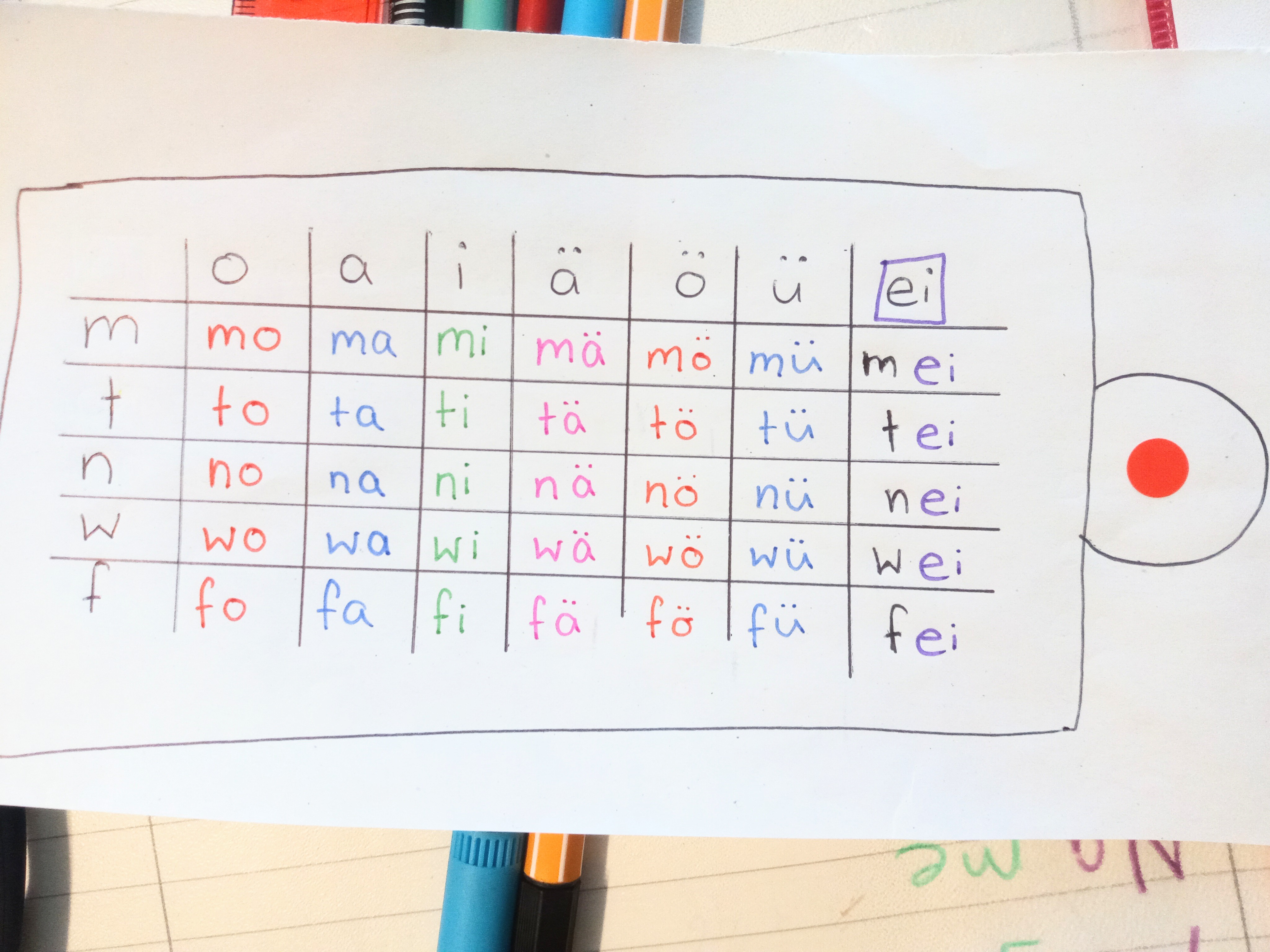 Die dritte Stufe besteht im verbinden von Silben. Auf diese und die vorherige Stufe ist mein Spiel (das du gerne nachmachen und variieren kannst) ausgerichtet. Einfache Sätze werden möglich. Durch Farben kannst du es dem Kind leichter machen – du kannst besondere Lautkombinationen (ei, au, ie, eu, ch) individuell farblich markieren – genau wie Wörter, die aus mehreren Silben bestehen – du kannst jede Silbe in einer anderen Farbe gestalten, um das Lesen zu unterstützen.
