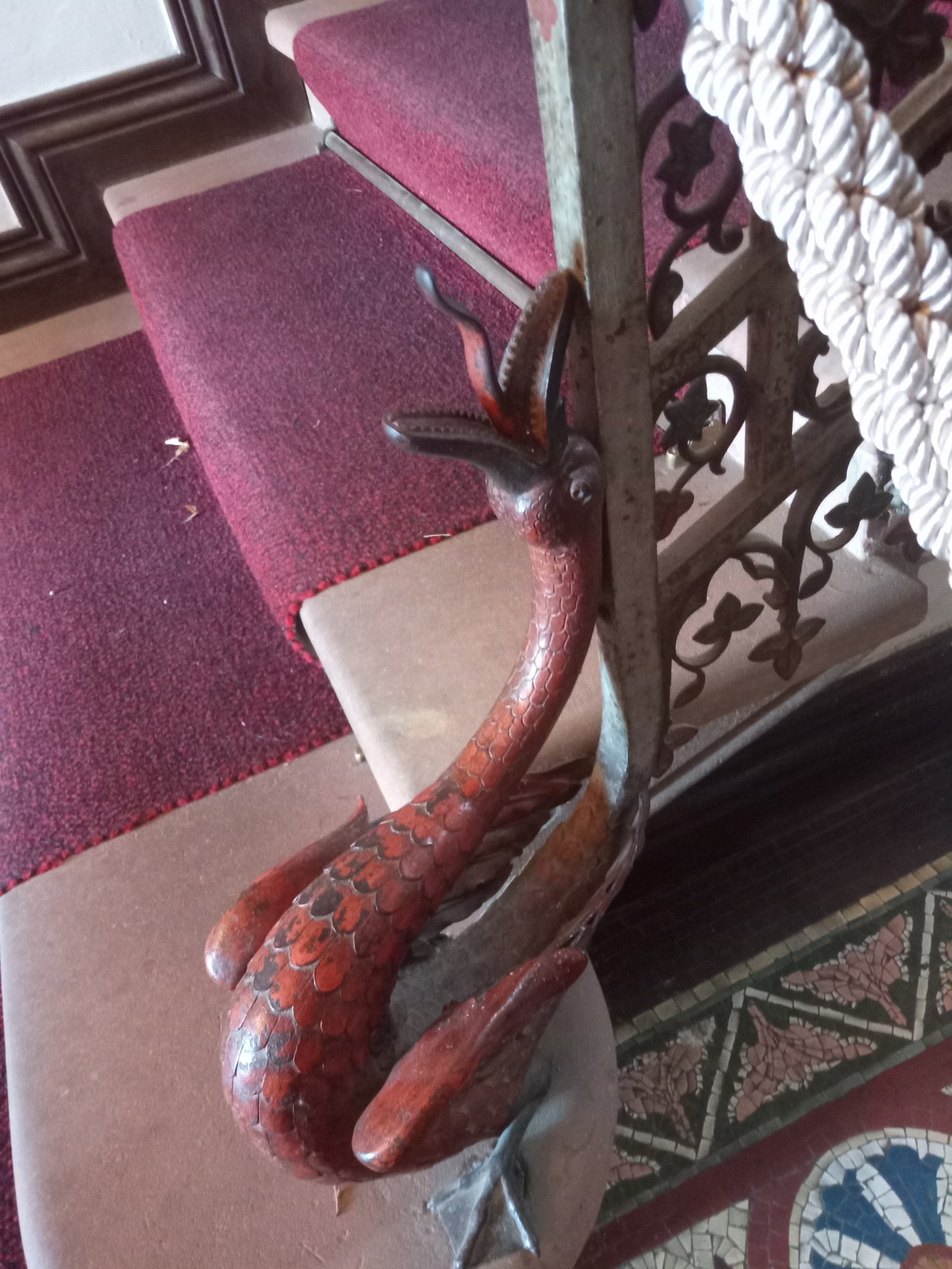 Ich bin allein. Werde langsamer. Schweife gedanklich ab, während ich die Umgebung beim Schlendern auf mich wirken lasse. Eine Treppe mit einer metallenen Drachenfigur – was wäre, wenn dieses mythische Wesen einfach zum Leben erwachte?
